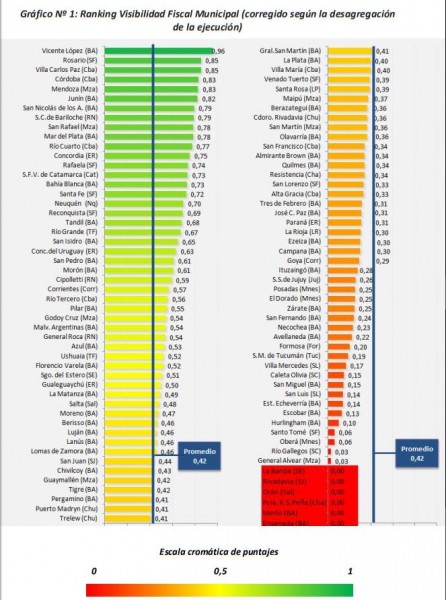 Este ranking informa que las intendencias difunden, en promedio, poco menos de la mitad de la información fiscal necesaria para el control de los gobiernos locales, pero destaca el comportamiento que lleva a cabo el Municipio de Vicente López porque tiene “la mejor web municipal en el índice de visibilidad de la información fiscal: un índice de 0,96 de un valor máximo de 1,00”, según el IARAF. El podio es completado por Rosario y Villa Carlos Paz (ambos con 0,85)