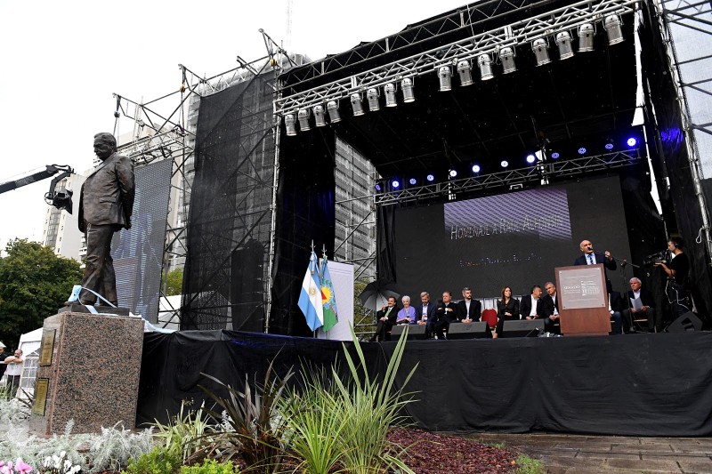 El Senado homenajeó al ex presidente de la Nación Raúl Alfonsín con el descubrimiento de una estatua de bronce de su figura en la tradicional Plaza Moreno del centro de la ciudad de La Plata.