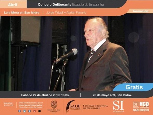 En el marco del Programa Espacio de Encuentro, iniciativa del Concejo Deliberante de San Isidro que promueve todo tipo de actividades gratuitas y abiertas a la comunidad, el presidente de la Asociación Hijos y Amigos de San Isidro, historiador y escritor Jorge Tirigall ofrecerá el sábado 27, a las 16, la charla “Lola Mora en San Isidro” en el legislativo local (25 de Mayo 459).