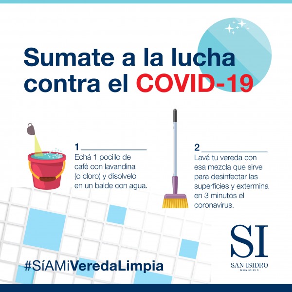 El Municipio de San Isidro lanzó la campaña a #SíAMiVeredaLimpia, en la que a través de una convocatoria en redes sociales, invita a los vecinos a colaborar con la higiene del Espacio Público limpiando sus veredas con agua clorada o con lavandina. “El objetivo es convocar a los vecinos a realizar una acción en conjunto en la lucha contra del COVID-19 desde sus casas”, explicó Leandro Martín, subsecretario de Espacio Público. La idea es que los vecinos limpien la vereda del frente de su casa con lavandina o cloro, replicando el método que utiliza el municipio en espacios públicos con agua clorada. El primer paso es echar un pocillo de café con lavandina o cloro y disolverlo en un balde con agua, lo que sirve para desinfectar superficies y exterminar en tres minutos las partículas del virus. |