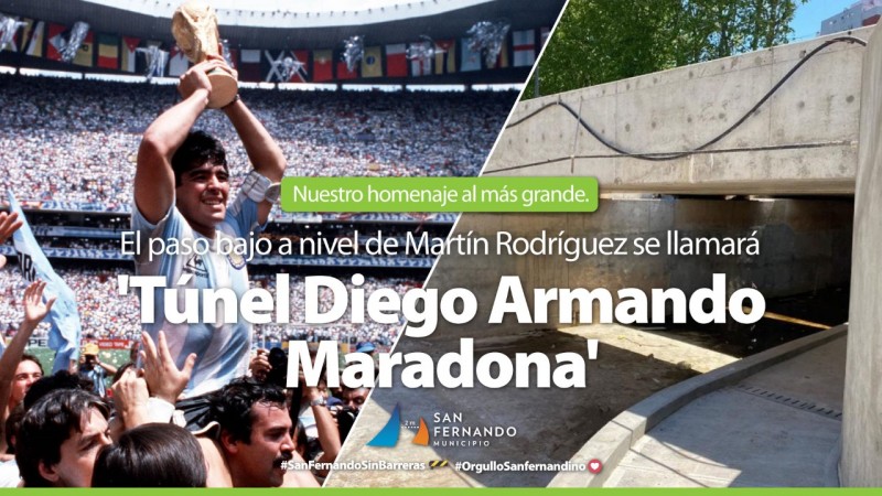 El Intendente de San Fernando comunicó en sus redes sociales que el paso bajo nivel próximo a inaugurar en Victoria llevará el nombre del ícono del deporte argentino. “Será el homenaje del pueblo de San Fernando al mejor jugador de la historia”, expresó Andreotti. También lo recuerdan pantallas de los centros comerciales. Toda la Argentina rinde homenajes a Diego Maradona en la fecha de su fallecimiento, y también el Municipio de San Fernando. En los centros comerciales las pantallas LED lo recuerdan como ‘Diego Eterno’, y el Intendente Juan Andreotti anunció que una de las obras más importantes de los últimos años tendrá su nombre: el Túnel de la calle Martín Rodríguez, en Victoria. “Será el homenaje del pueblo de San Fernando al mejor jugador de la historia”, explicó el Jefe Comunal en sus redes sociales de Facebook e Instagram, sobre la decisión de llamar ‘Diego Armando Maradona’ al 7mo Túnel sanfernandino. “Enviaremos al Concejo Deliberante el proyecto de ordenanza para su aprobación”, confirmó Andreotti. La obra conectará el centro de Victoria con el barrio Crisol, tendrá doble circulación con forma de “X” y una altura máxima de 4,20m que permitirá el paso de colectivos y vehículos de gran porte. Además, tendrá rampas peatonales accesibles para sillas de ruedas según reglamentación y una renovación integral en los alrededores. |